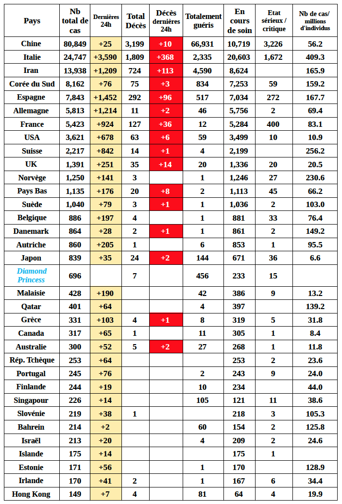 1 – Pour l’Italie, l’Iran, l’Espagne et la France, la situation reste préoccupante et l’épidémie n’a pas encore atteint son pic. Le nombre des décès par coronavirus de ces 4 pays (613) représente 91,6% des décès de la planète (669) pour la journée d’hier. L’Italie, désormais leader mondial pour le nombre de décès quotidiens, compte, à elle seule, 55 % des décès de la planète par coronavirus des dernières 24 heures.