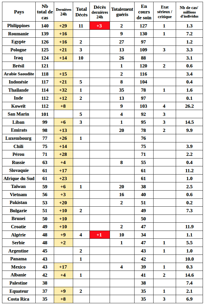 Situation du COVID-19 (Coronavirus) au 16 mars