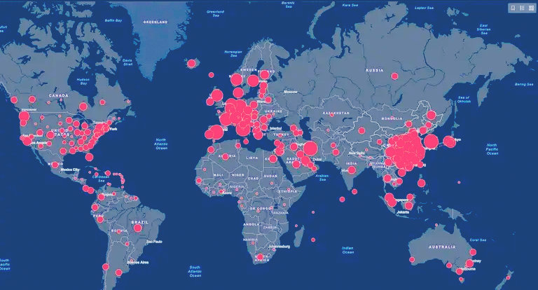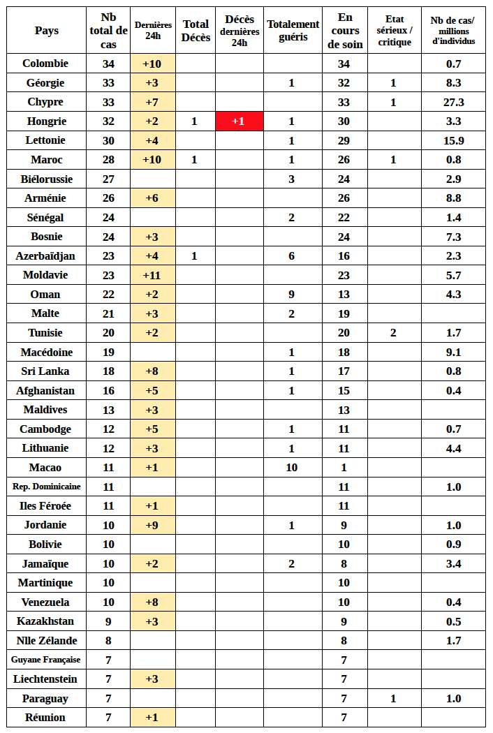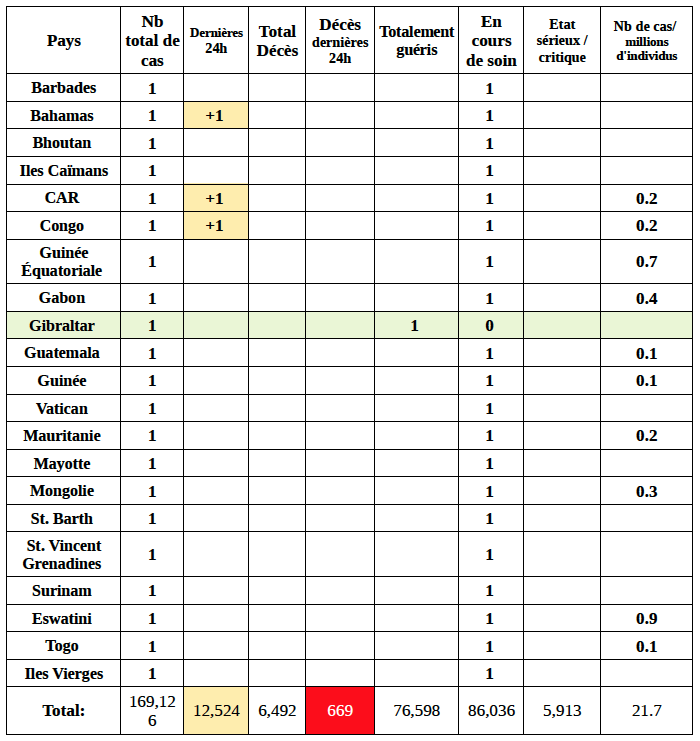 157 pays ont été, à ce jour, affectés par le virus, pour 169 126 cas déclarés 110 pays ne comptent aucun décès. 35 pays déclarent entre 1 et 10 décès. 7 pays déclarent entre 11 décès et 100 décès. 5 pays ont enregistré plus de 100 décès (Chine, Italie, Iran, Espagne, France). Sur les 6 492 décès enregistrés dans le monde, 6 151 l’ont été dans ces 5 pays (94,7%)