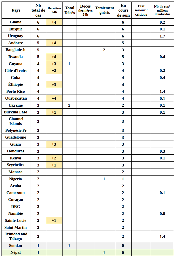 Le nombre de nouveaux cas enregistrés (25) restent très faible à l’échelle du pays, et le nombre de personnes déclarées en situation sérieuse ou critique baissent sensiblement: 3 226 aujourd’hui contre 3 610 hier. Ceci confirme que l’extinction de l’épidémie y est en bonne voie.