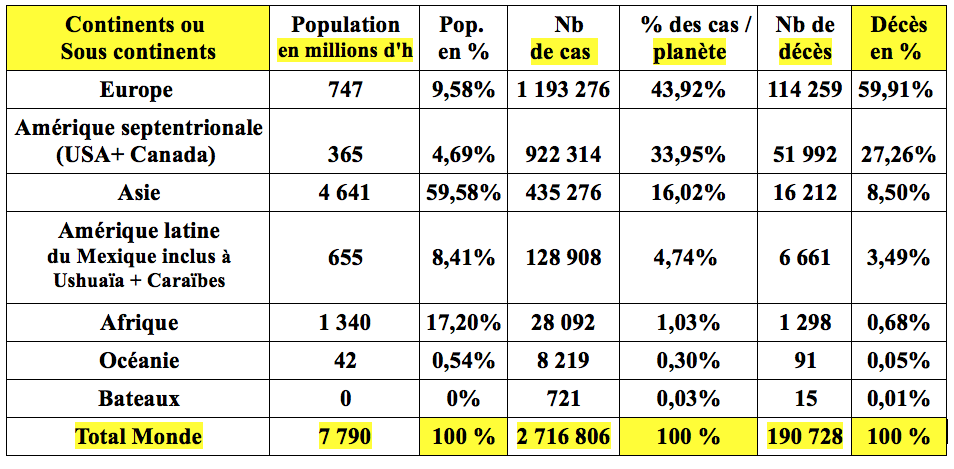 Un tableau du bilan actuel du nombre de cas et de décès par grande région du monde permet de réaliser celles qui s’en sortent bien, pour l’instant, et celles qui ont souffert et continuent de souffrir.
