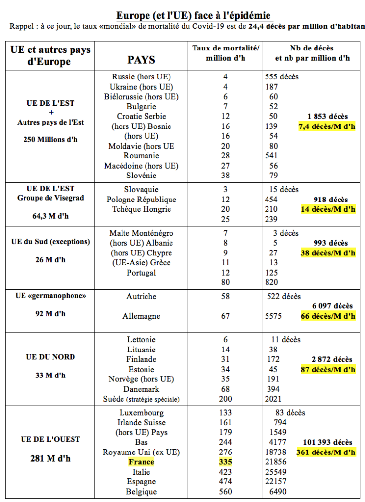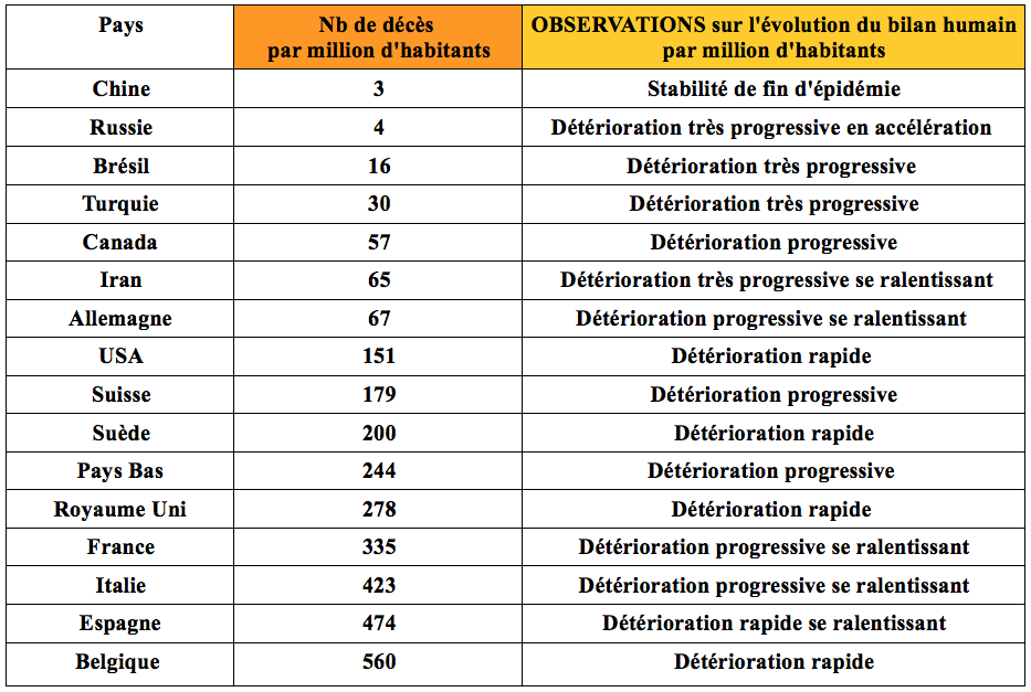 Les taux de mortalité par million d’habitants des 15 pays ayant dépassé les 1000 décès (+ Russie), dans le tableau ci dessous, donne une petite idée de la qualité de la gestion de l’épidémie par les gouvernances de chacun des états.