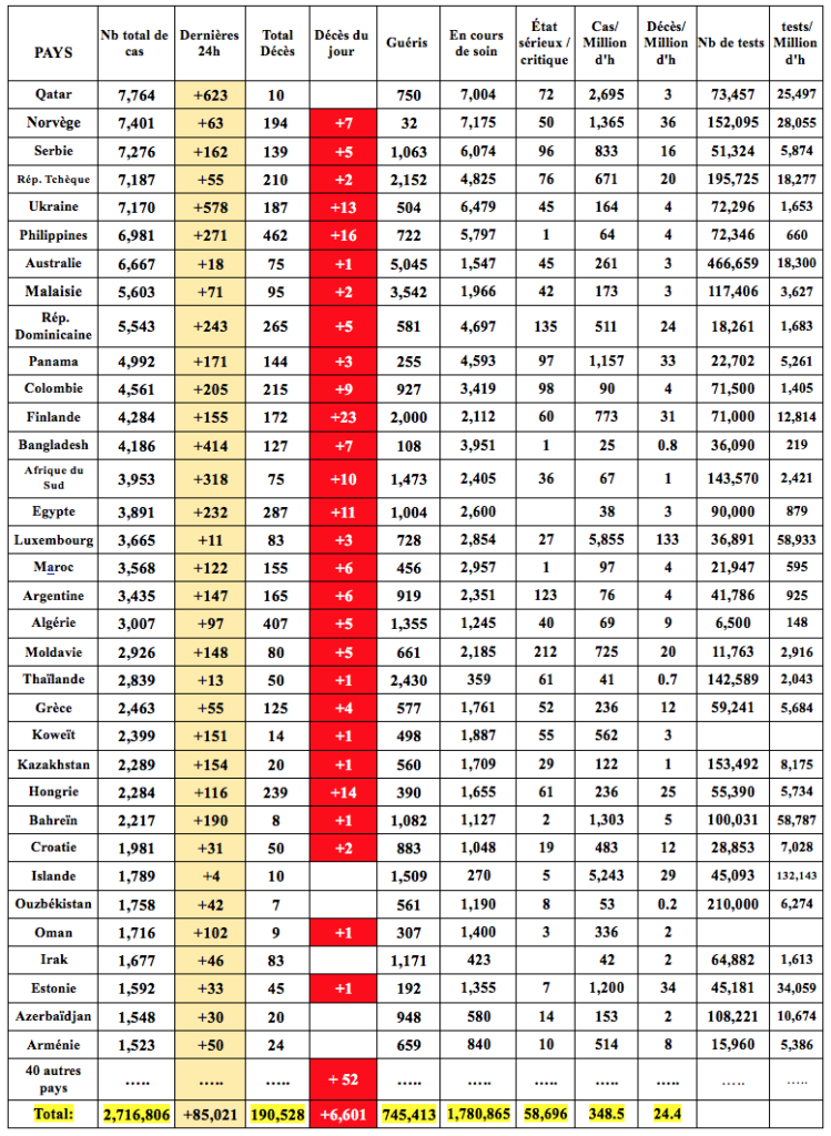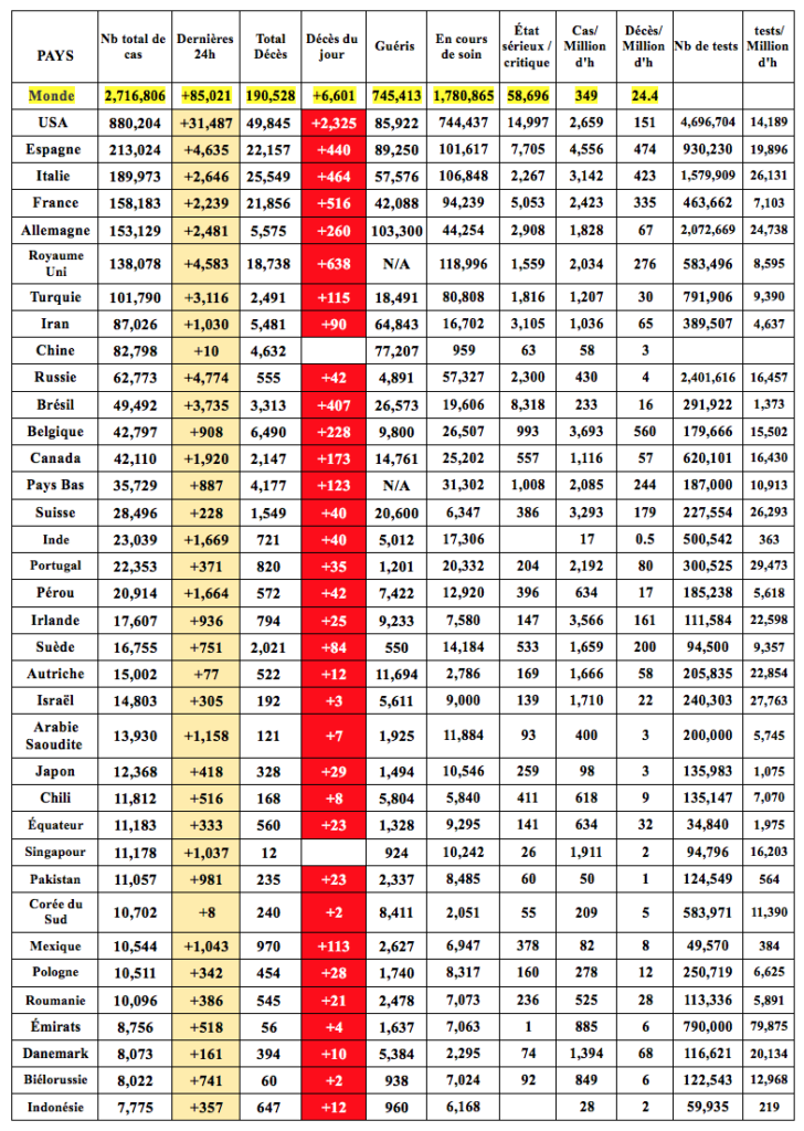 Les bilans les plus lourds de la journée d’hier restent ceux des USA , de la France et du Royaume Uni. Ces pays enregistrent, à eux trois : 45,1% des nouveaux cas, 55,7 % des nouveaux décès et 36,8% des cas critiques de la planète.