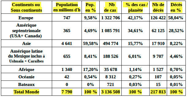 Un tableau du bilan actuel du nombre de cas et de décès par grande région du monde permet de réaliser celles qui s’en sortent bien, pour l’instant, et celles qui ont souffert et continuent de souffrir.