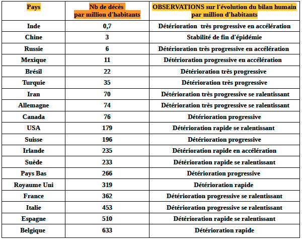 Les taux de mortalité par million d’habitants des 18 pays ayant dépassé les 1000 décès (+ Russie), dans le tableau ci dessous, donne une petite idée des zones géographiques les plus touchées et de la qualité de la gestion de l’épidémie par les gouvernances de chacun des états.