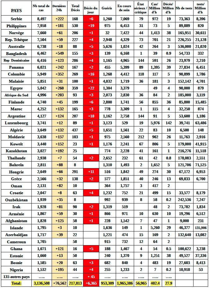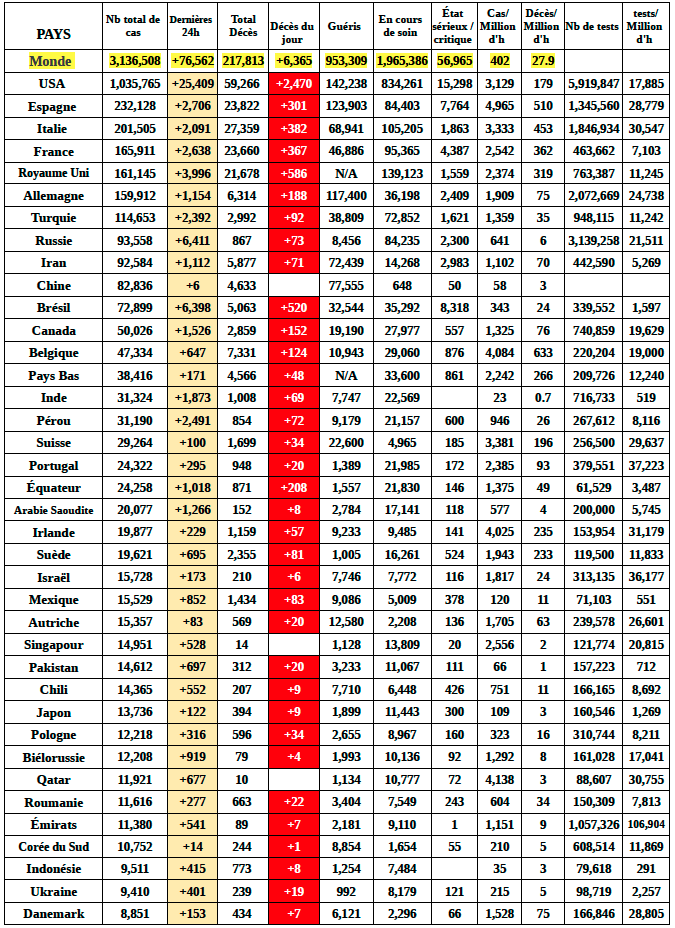 La Russie teste toujours beaucoup (130 000 tests hier), d’où un nombre très élevé de nouveaux cas détectés ( encore 2ème derrière les USA à plus de 6 000). Ce qui est préoccupant, pour elle, c’est le nombre élevé des cas sérieux ou critiques. Le nombre des décès ira croissant dans les jours qui viennent. La Russie devrait passer le cap des 1 000 décès dans la journée du 30 avril, avec le Pérou, l’Équateur et le Portugal.