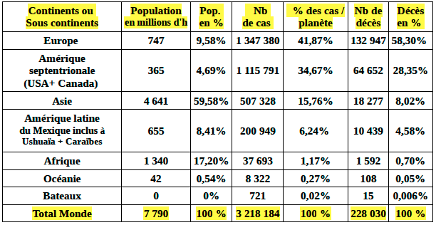 Un tableau du bilan actuel du nombre de cas et de décès par grande région du monde permet de réaliser celles qui s’en sortent bien, pour l’instant, et celles qui ont souffert et continuent de souffrir.