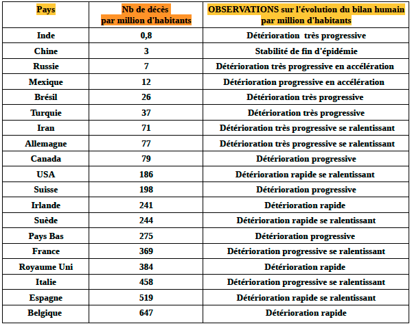 Les taux de mortalité par million d’habitants des 18 pays ayant dépassé les 1000 décès (+ Russie), dans le tableau ci dessous, donne une petite idée des zones géographiques les plus touchées et de la qualité de la gestion de l’épidémie par les gouvernances de chacun des états.