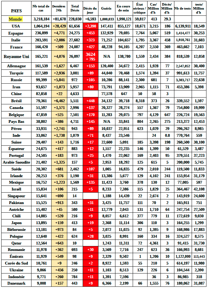 - 228 030 décès (6 593 hier + 3 624 régularisation UK) ; 1 000 033 guérisons (+ 46 700 hier) ;