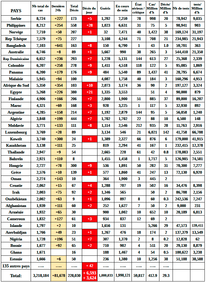 La Russie teste toujours beaucoup (165 000 tests hier), d’où un nombre très élevé de nouveaux cas détectés (encore 2ème derrière les USA à plus de 5 800). Ce qui reste préoccupant, pour elle, c’est le nombre élevé des cas sérieux ou critiques. Le nombre des décès ira croissant dans les jours qui viennent. La Russie devrait passer le cap des 1 000 décès aujourd’hui 30 avril, avec le Pérou et le Portugal.