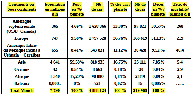 Un tableau du bilan actuel du nombre de cas et de décès par grande région du monde permet de voir, en un coup d’œil, celles qui s’en sortent bien, pour l’instant, et celles qui ont souffert et continuent de souffrir. Les continents ou sous continents sont classés par taux de mortalité.