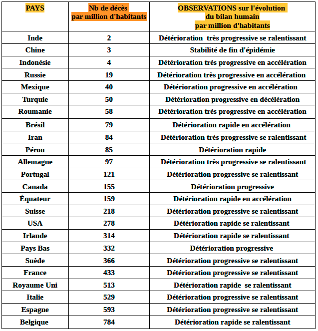 Les situations de la Suède, du Canada, de l’Inde, de l’Irlande, du Portugal sont stables, celles de la Turquie, de l’Iran et de la Suisse s’améliorent, celles de la Russie, du Brésil, de l’Équateur, du Pérou et du Mexique se détériorent. A noter que pour la Turquie le nombre de guérisons est plus important que celui des nouveaux cas. Si les pertes rapportées à la population sont importantes pour des petits pays comme la Belgique, les Pays Bas, l’Irlande, la Suisse et la Suède, elles restent faibles pour l’Iran, la Turquie, le Pérou, le Mexique et le Canada et très faibles pour la Russie et pour l’Inde.