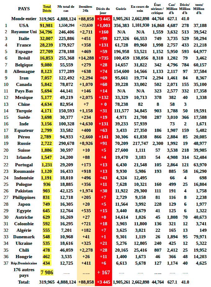 319 965 (+ 11 800 en 72 h) décès ; 1 905 261 guérisons (+ 150 113 en 72 h) ;