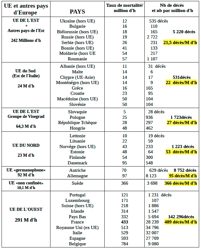 Ci après, voici le tableau de données concernant l’Europe et l’UE face à l’épidémie.