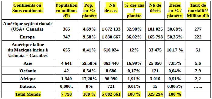 Un tableau du bilan actuel du nombre de cas et de décès par grande région du monde permet de voir, en un coup d’œil, celles qui s’en sortent bien, pour l’instant, et celles qui ont souffert et continuent de souffrir. Les continents ou sous continents sont classés par taux de mortalité.
