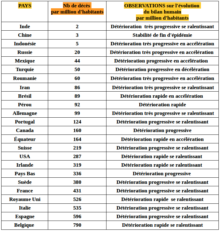 Le tableau présenté ci après ne comporte que les 38 pays ayant enregistré plus de 400 décès. Il représente plus de 97,5% du bilan des pertes humaines déclarées de la pandémie.