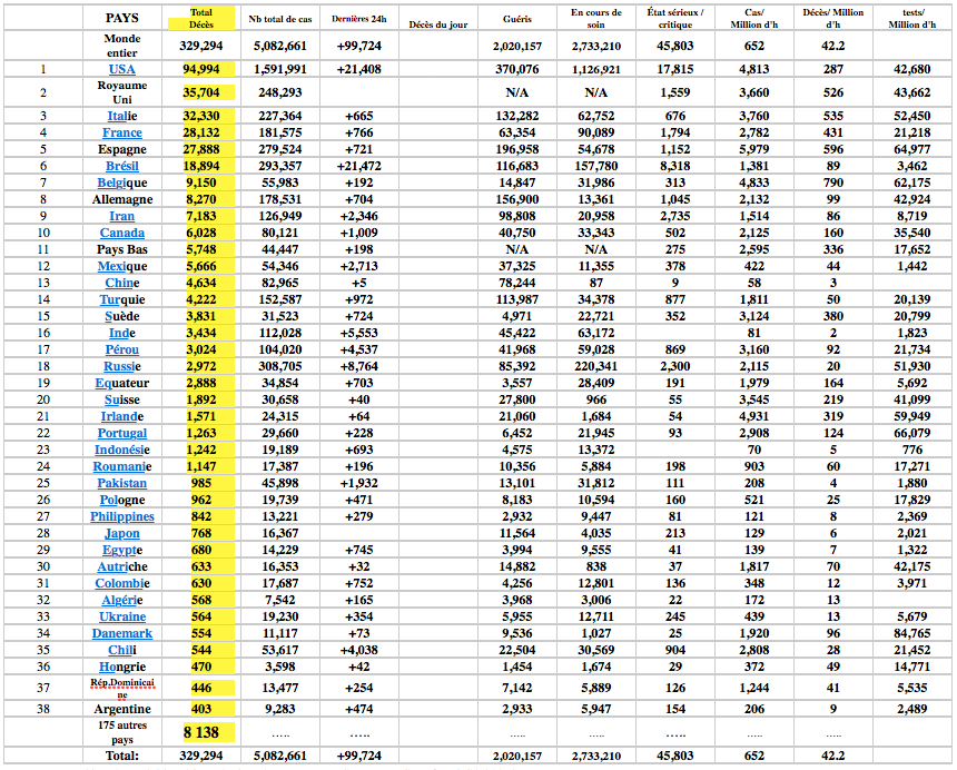 - Sur les 329 294 décès enregistrés dans le monde depuis le début de l’épidémie, 312 110 l’ont été dans ces 24 pays(94,8%).