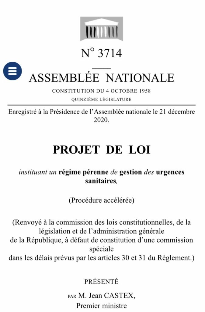 Le Premier Ministre Jean Castex a déposé le 21 décembre, en procédure accélérée, un projet de loi de 92 pages (projet de loi No 3714), instituant un régime pérenne de gestion des urgences sanitaires.