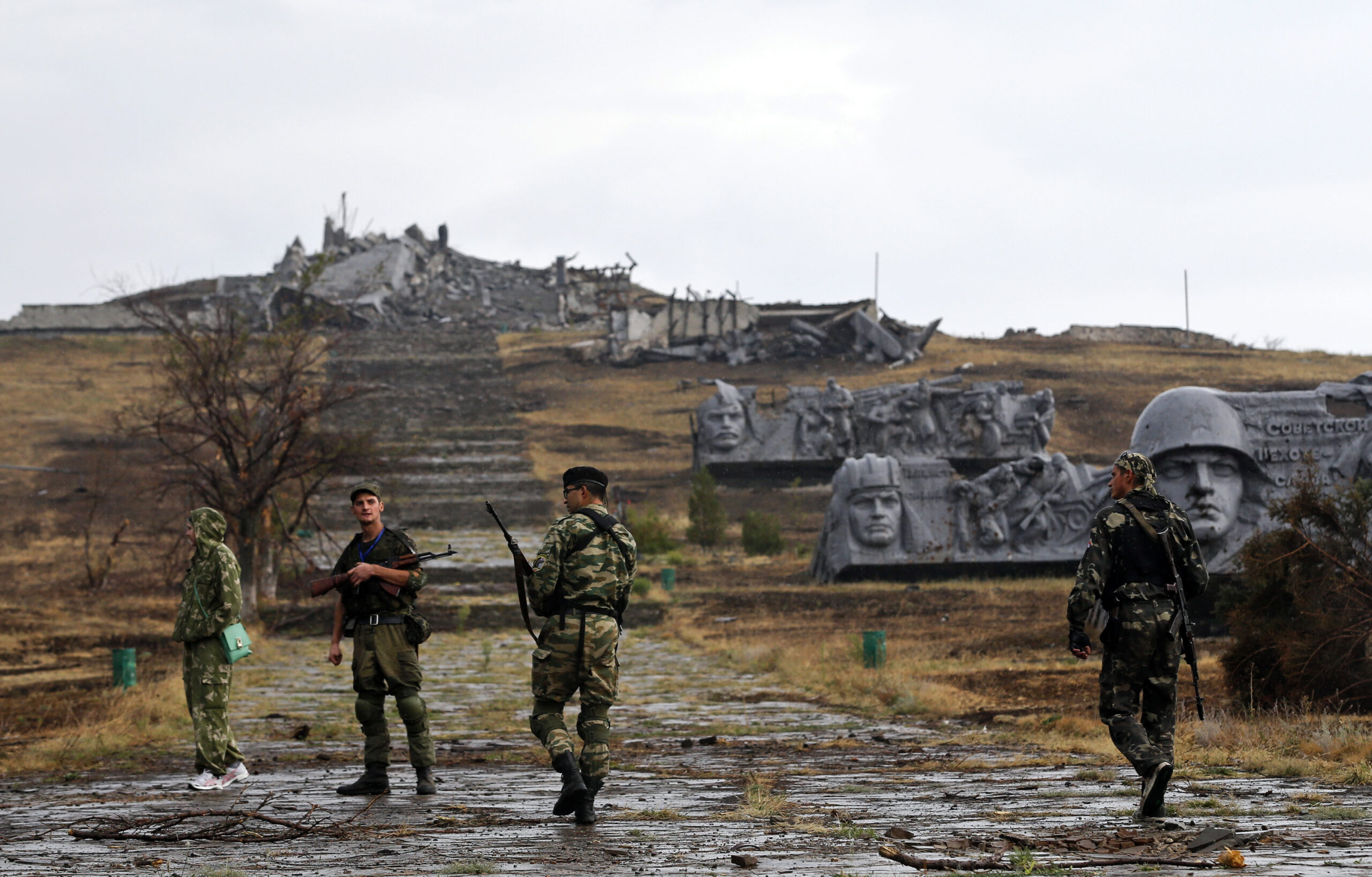 Illustration : Combattants de la “République populaire de Donetsk”, auprès d’un monument de guerre soviétique endommagé par les combats à l’extérieur de la ville, le 28 août. REUTERS/Maxim Shemetov)